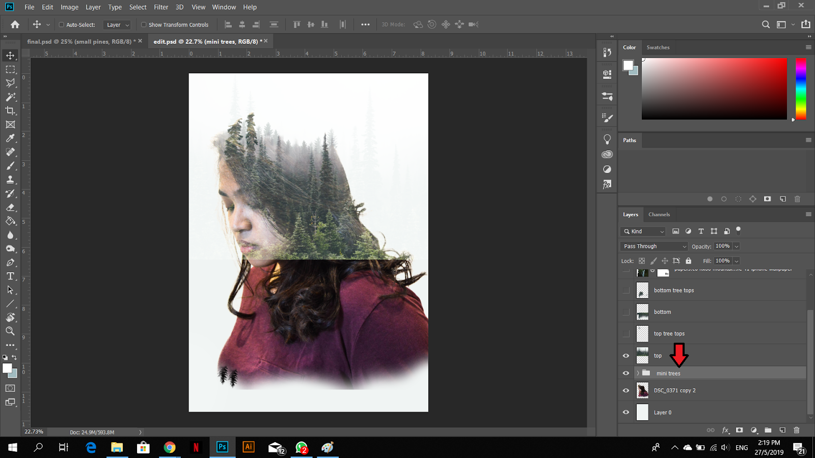 To merge the layers I simply moved the silhouette trees layer below the main trees layer.